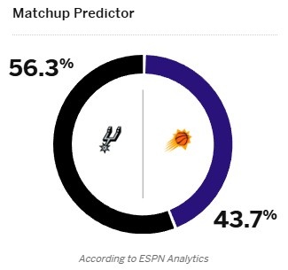 Today, ESPN gave a prediction of the winning probability of this game, with the Spurs at 56.3% and the Suns at 43.7%.