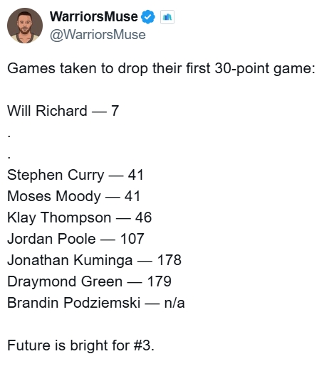 This is also the seventh game of his career. For comparison, Curry and Moody both scored their first 30+ in the 41st game of their respective careers; Clay's was the 46th, and Poole's was the 107th;