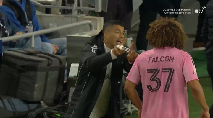 In the 24th minute of the game, the broadcast camera showed Suarez, who was off the field as a substitute today. He called up his team's starting central defender Falcon, and seemed to be imparting experience to the latter face to face.