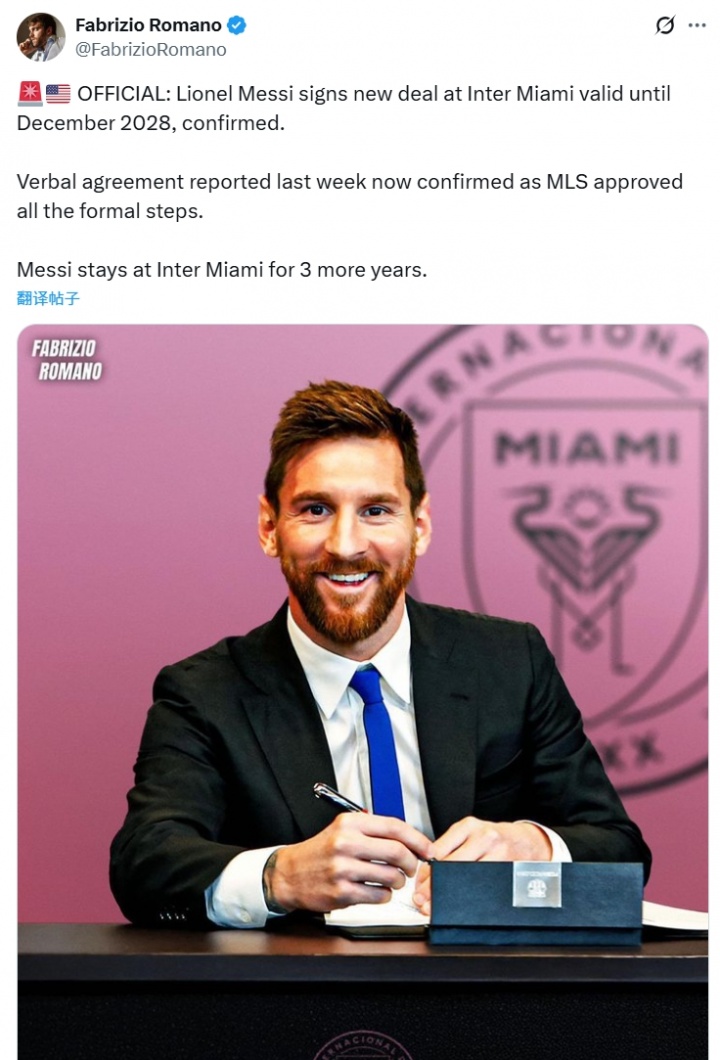 Romano confirmed that Messi has renewed his contract with Inter Miami until 2028. Romano used an official tone, but Inter Miami has not yet officially announced the news of Messi's contract extension.