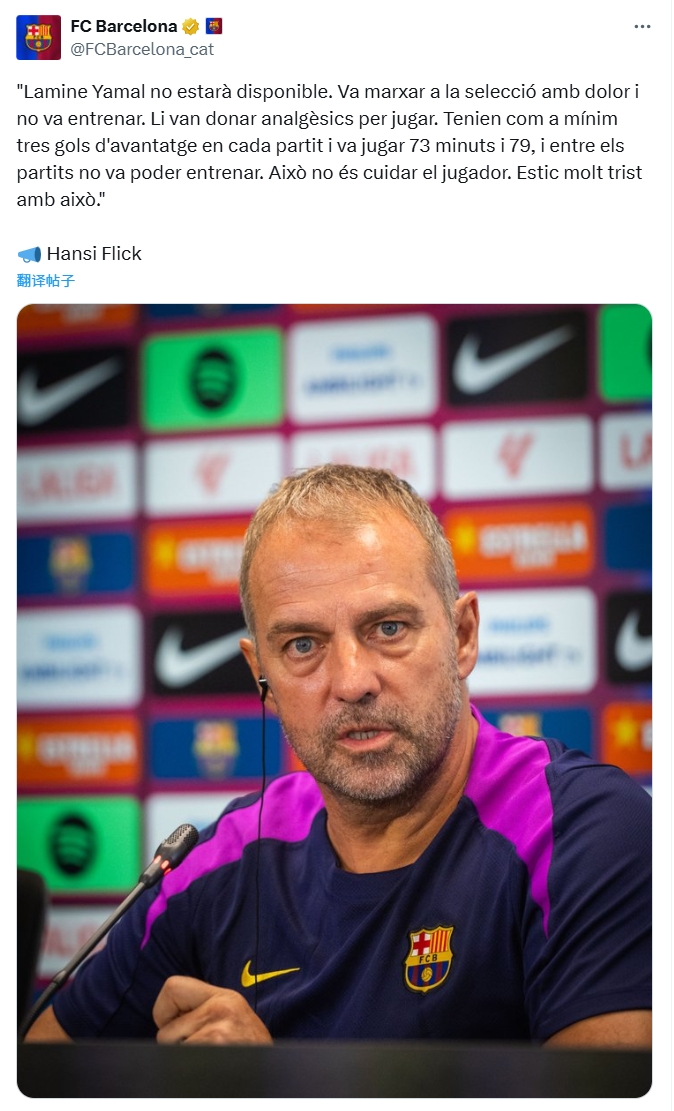 Frick confirmed at the pre-match press conference that Yamal will miss the game tomorrow due to injury. During the national team's match day, the Spanish national team doctor gave Yamal painkillers and allowed him to play.