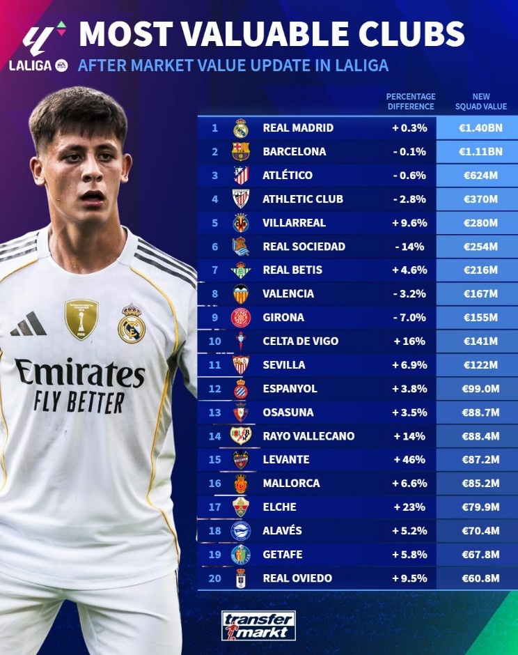 La Liga team value list: Real Madrid ranks first with 1.4 billion euros, Barcelona ranks second with 1.11 billion euros, Atletico Madrid third