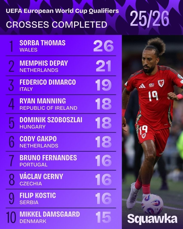 This World European qualifying group stage has come to an end. Squakwa also counted the number of successful crosses in this tournament, with Welsh winger Thorba Thomas leading the way.