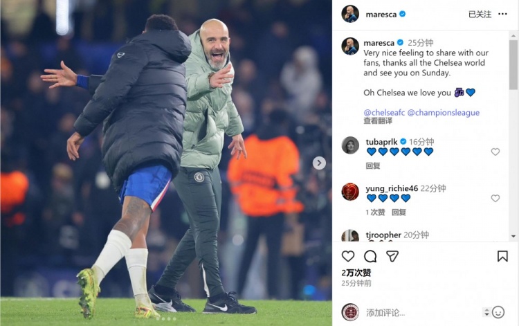 Chelsea coach Maresca posted a photo on social media to celebrate the victory, with the text: "It feels great to share the joy of victory with our fans. Thank you to the entire Chelsea family. See you on Sunday. Chelsea, we love you deeply (lyrics)!"