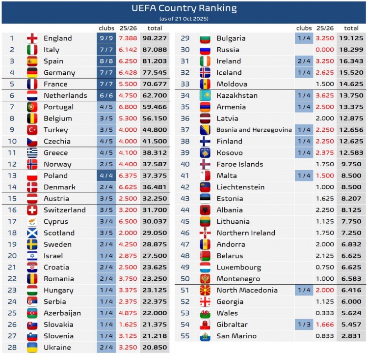 Spain - 6.250 in the 25-26 season - total points 81.203