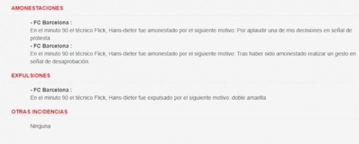 The referee's report showed that Flick first received a yellow card for "expressing protest by clapping", and then received another yellow card for "making a gesture of dissatisfaction". Two yellow cards were turned into one red and he was sent off.