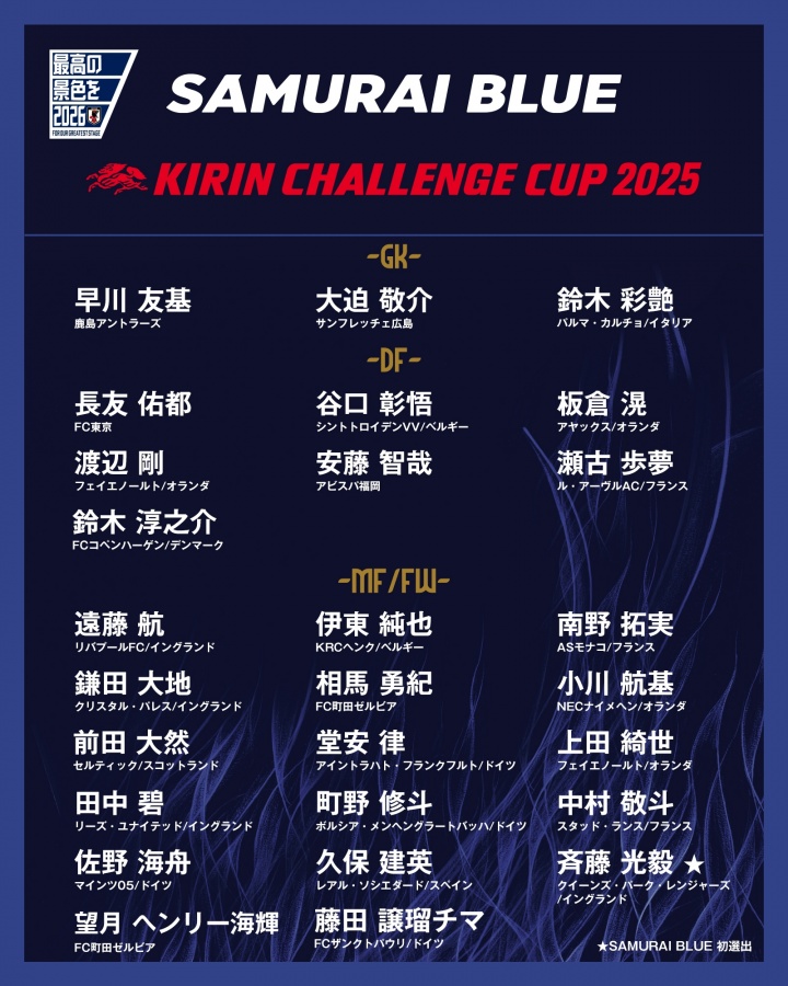 Midfield and frontcourt: Koto Endo (Liverpool), Junya Ito (Genk), Takumi Minami (Monaco), Kamada Dadi (Mi Azumiya), Aima Yuki ( Machida Zevia), Ogawa Yokiki (Nimegen), Maeda Daran (Celtic), Doa Ari (Frankfurt), Ueda Kise (Feyenoord), Tanaka (Leeds United), Shuto Machino (Bontaine), Keito Nakamura (Lance), Katsuki Sano (Mainz), Keneyo Kubo (Real Sociedad), Kintoshi Saito (Queen Park Ranger, first selected), Matsuki Hiroshiki (Machida Zevia), Jesuki Fujita-Kima (Sao Paulo)