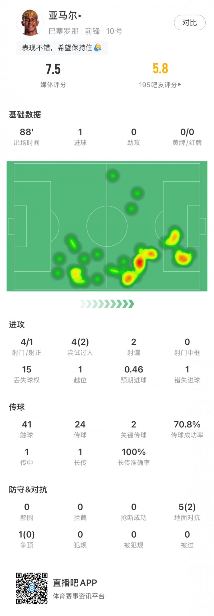 Yamal statistics: 4 shots, 1 goal, 1 goal, 2 key passes, expected goals 0.46, rating 7.5